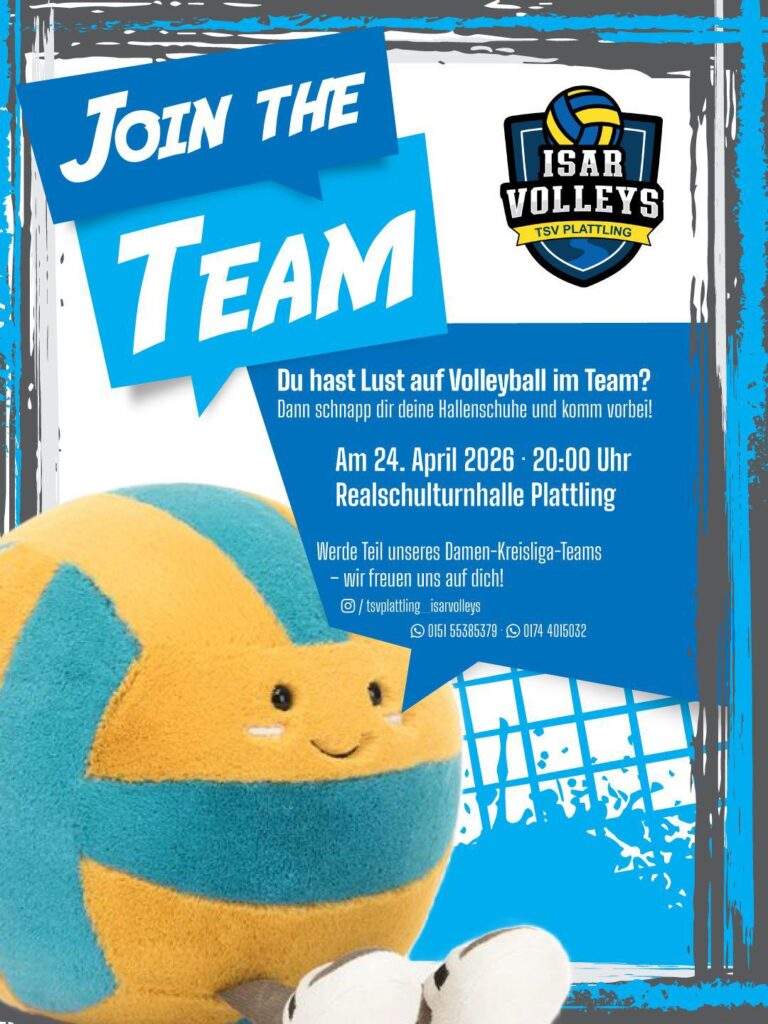 Jede Interessierte für das Probetraining meldet sich bitte auf Instagramm unter tsvplattling_isarvolleys oder kontaktiert entweder die Telefonnummer 015155385379 oder 01744015032. Dabei ist jede Interessierte herzlich eingeladen, egal, ob mit Volleyballerfahrung oder ohne. Die Damenmannschaft will nach dem Abstieg aus der Bezirksklasse Nord-Ost einen sportlichen Neuanfang machen und dafür ein neues Team zusammenstellen. Dabei steht besonders der Zusammenhalt im Team mit den neuen Spielerinnen im Vordergrund.