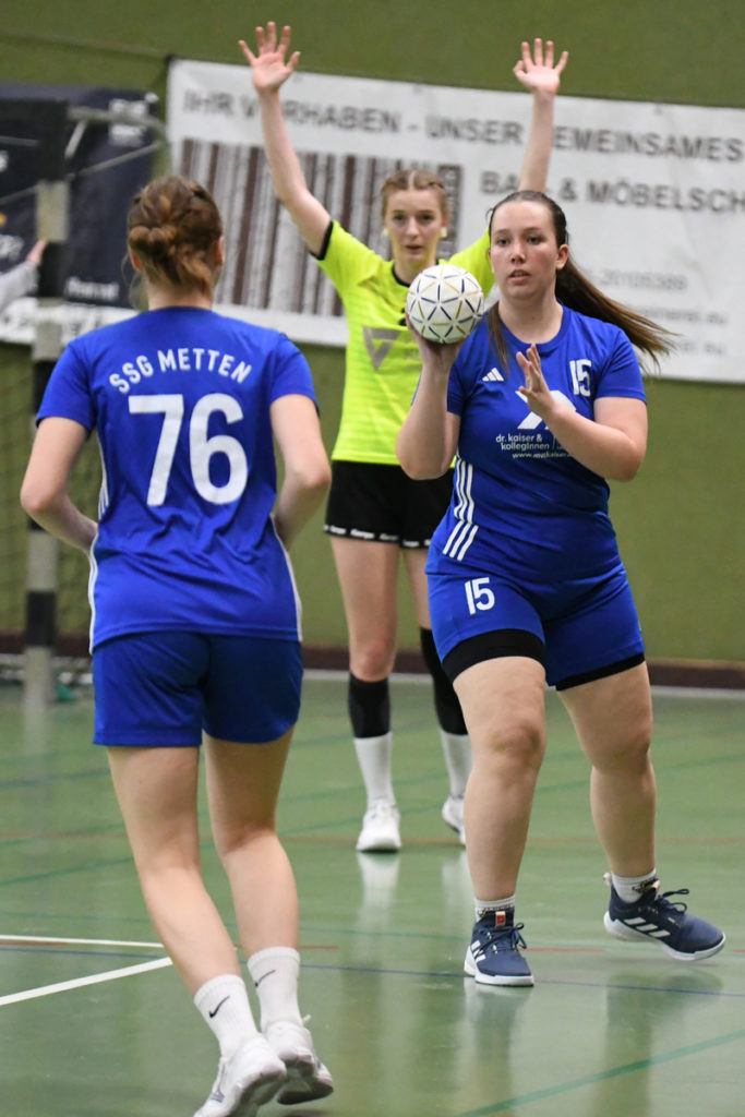 Nach Wiederanpfiff boten die Gastgeberinnen erneut rassigen Tempohandball bei gleichzeitig stabiler Defensivarbeit. Die wieder einmal souveräne Torhüterin Tanja Kraus hatte zudem ausreichend Beton zur Kastenverdichtung angerührt. Mitte der zweiten Hälfte war Metten mit einer zehn Treffer-Differenz zum 29:19 durch Leni Geßl davongeeilt.